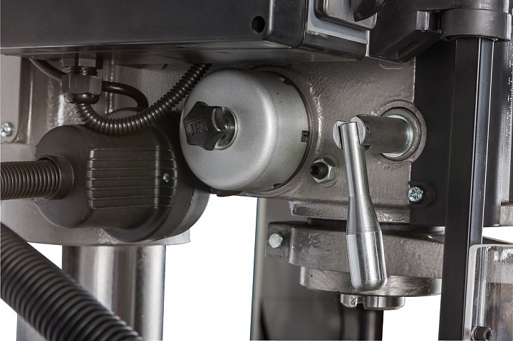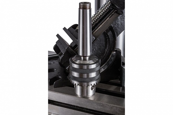 Сверлильно-фрезерный станок выполняет широкий спектр операций. Максимально допустимый диаметр сверления составляет 30 мм. При выполнении фрезерных работ допускается работа концевыми фрезами с максимальным диаметром 20мм и фрезами для торцевого фрезерования с максимальным диаметром 75мм. Модель оснащена шпинделем с конусом МК3, зажимная тяга которого составляет М12. Для повышения жесткости фиксации опора шпинделя оборудована группой конических подшипников. Ход пиноли составляет 125мм. Для повышения качества обработки и повышения производительности работ, на станке установлена функция микроподачи шпинделя. Технологический процесс контролируется механической регулировкой вылета шпинделя.