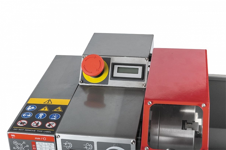 На дисплее отображается частота вращения шпинделя. Кнопка аварийной остановке станка отключает вращение и подачу на станке в случае нештатной ситуации.