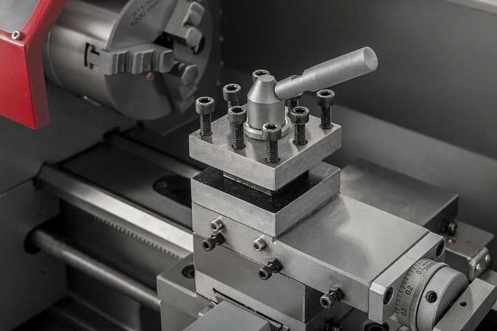 Четырех позиционная резцедержка для установки 4-х резцов. Резцедержка вращается и фиксируется точно перпендикулярно оси вращения станка.