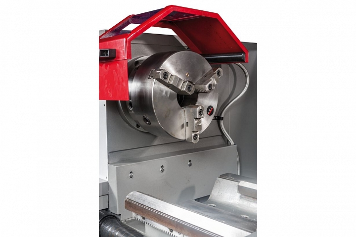 Коробка подач GH-2640 ZH DRO имеет 65 режимов продольных и поперечных автоматических подач для нарезки метрической, дюймовой, модульной и питчевой резьб. При этом частота биений на шпинделе не превышает 9 микрон. Станок помещен на массивную станину из высокотехнологичного чугуна, что позволяет эффективно гасить вибрации и отводить тепло. Направляющие станины подготавливаются по фирменной технологии производителя. Предусмотрены ускоренное перемещение суппорта, педаль тормоза и аварийного отключения.